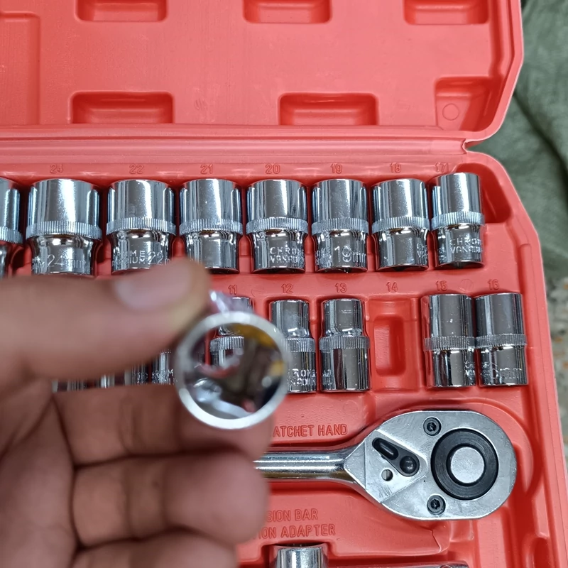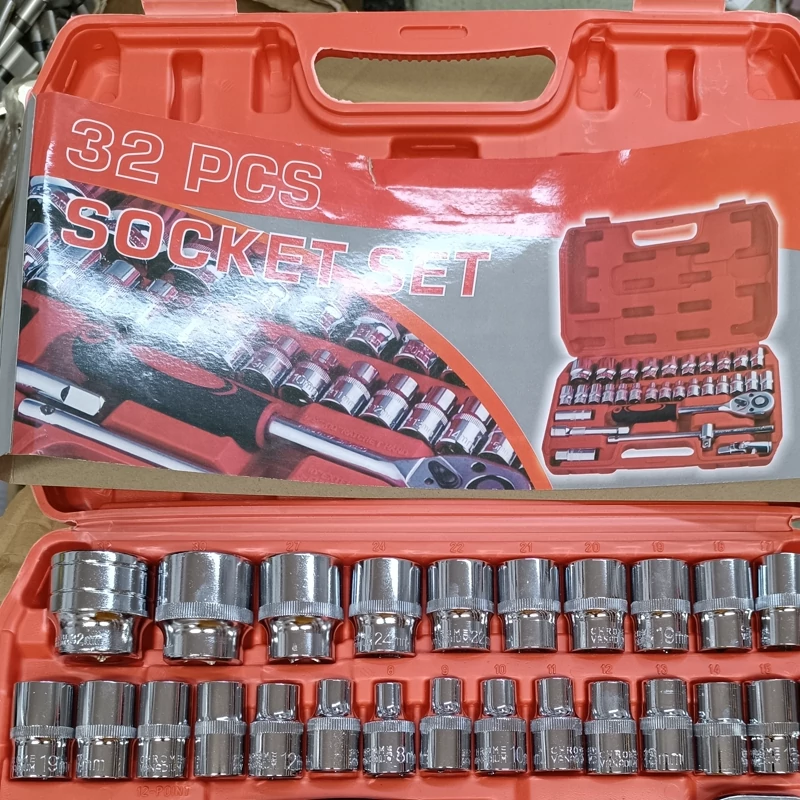 نوع : جعبه بکس تعداد : 32 پارچه آلیاژ : کروم وانادیوم نوع پولیش : مات سایز درایو : 1/2 اینچ دارای 19 عدد بکس 6 گوش به سایزهای : 8.9.10.11.12.13.14.15.16.17.18.19.20.21.22.24.27.30.32 دارای 6 عدد بکس 12 گوش به سایزهای : 10.12.14.15.17.19 دارای 2 عدد بکس بلند به سایزهای : 16 و 22 دارای دسته جغجغه با دسته روکش دار و قفل دار دارای دو عدد رابط بکس بلند و کوتاه دارای یک عدد لقلقه دارای کیف حمل بی ام سی